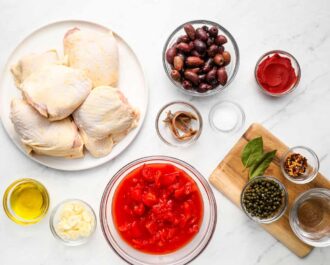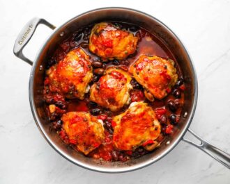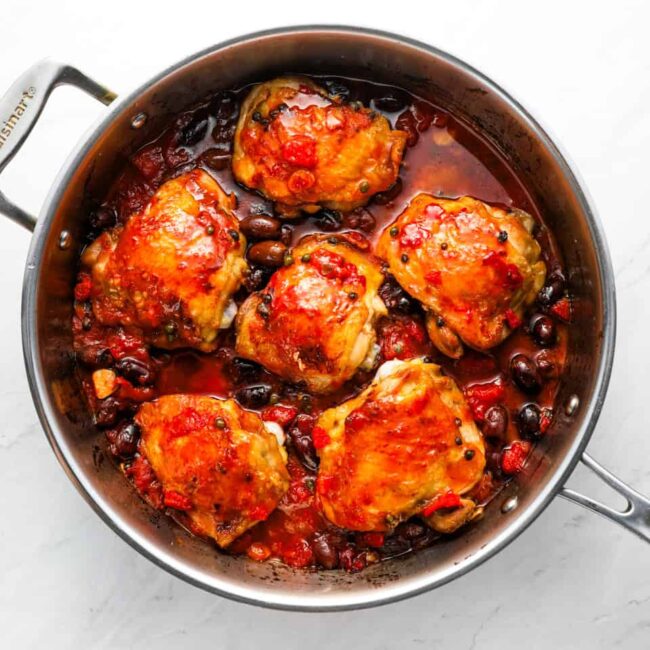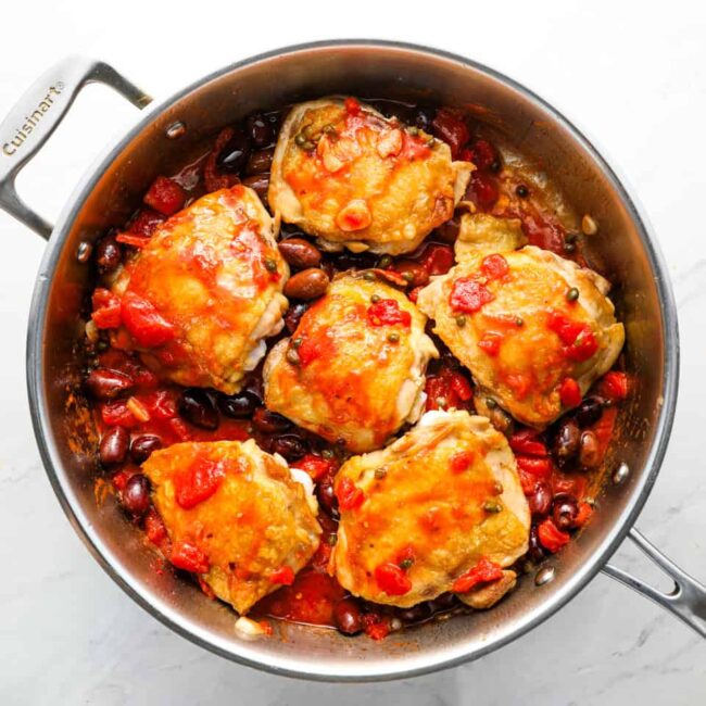 If you love rich and savory chicken dishes, you absolutely must make this chicken puttanesca recipe! I cook fatty chicken thighs with tomatoes, garlic, anchovies, olives, capers, and more to create a deeply tangy puttanesca sauce. This one pot Neapolitan chicken recipe is a satisfying low-carb, keto-friendly meal that my whole family loves!
