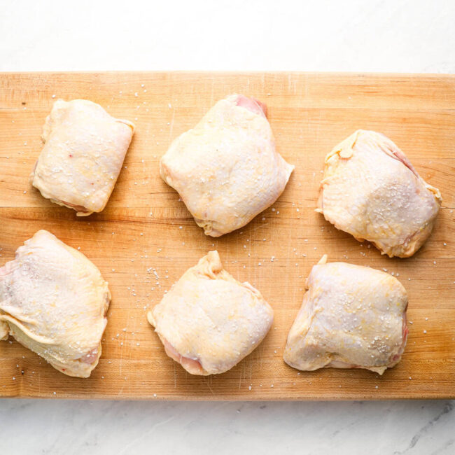Pat 3 pounds of bone-in, skin-on chicken thighs dry and season lightly with kosher salt on all sides. I used about 1 teaspoon across all the thighs. Remember, we’re adding a lot of other salty components (anchovies, capers, olives), so we don’t need too much salt here.