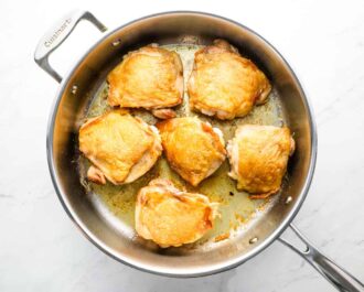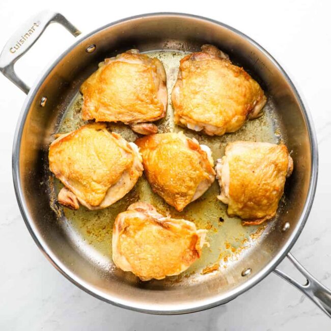 Heat 2 tablespoons of olive oil in a large skillet set over medium heat. Add in the chicken thighs, skin side down, and cook without moving until the skin is golden, about 5-7 minutes. Flip and cook on the second side until browned, about 5 minutes. Remove from the skillet and set aside.