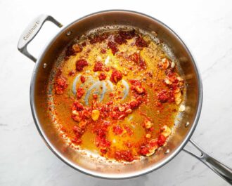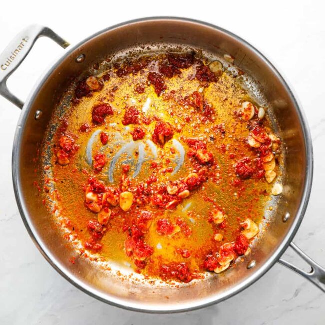 Stir in ½ teaspoon of crushed red pepper flakes (more if you like it spicy!) and 2 tablespoons of tomato paste. Cook and stir until the tomato paste is mostly incorporated into the oil.
