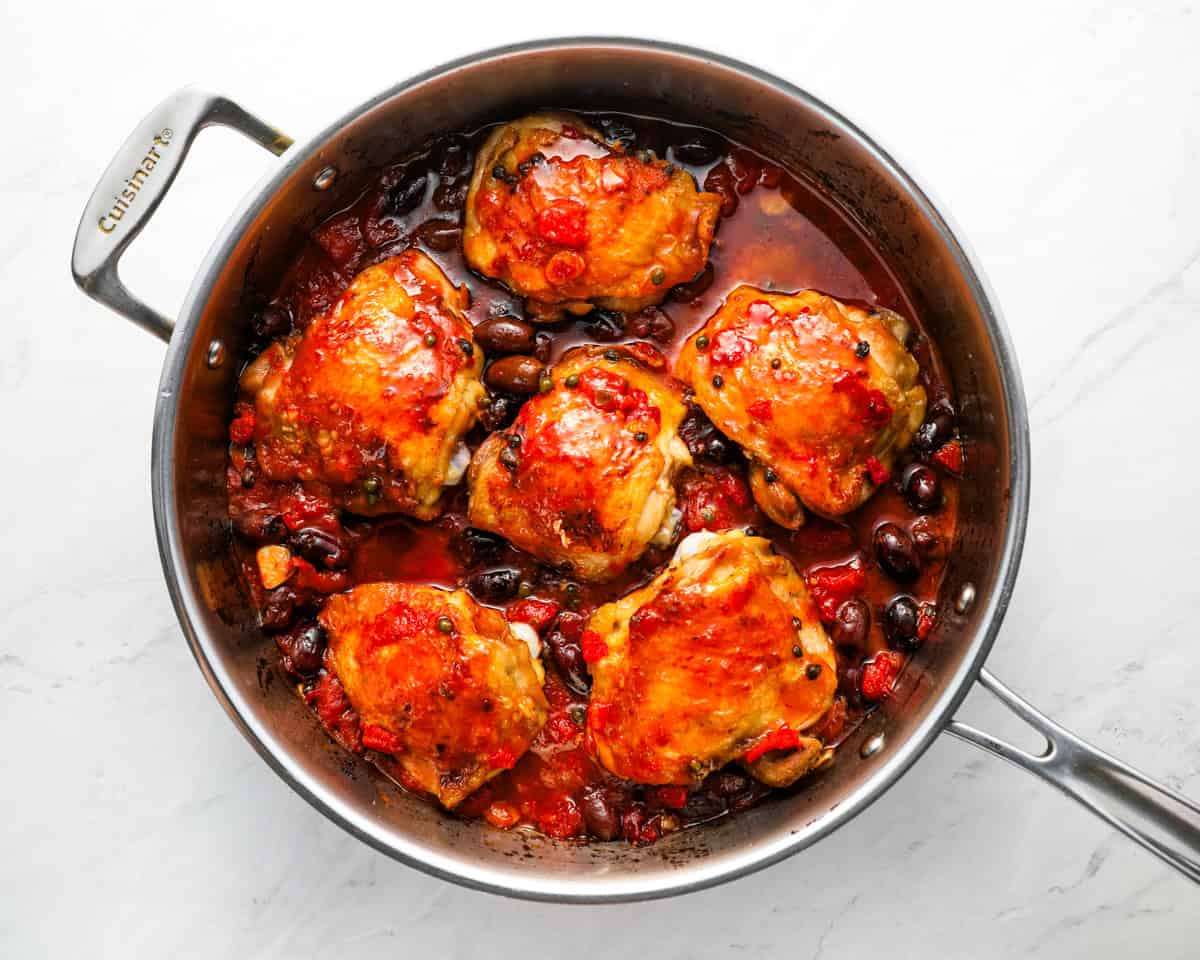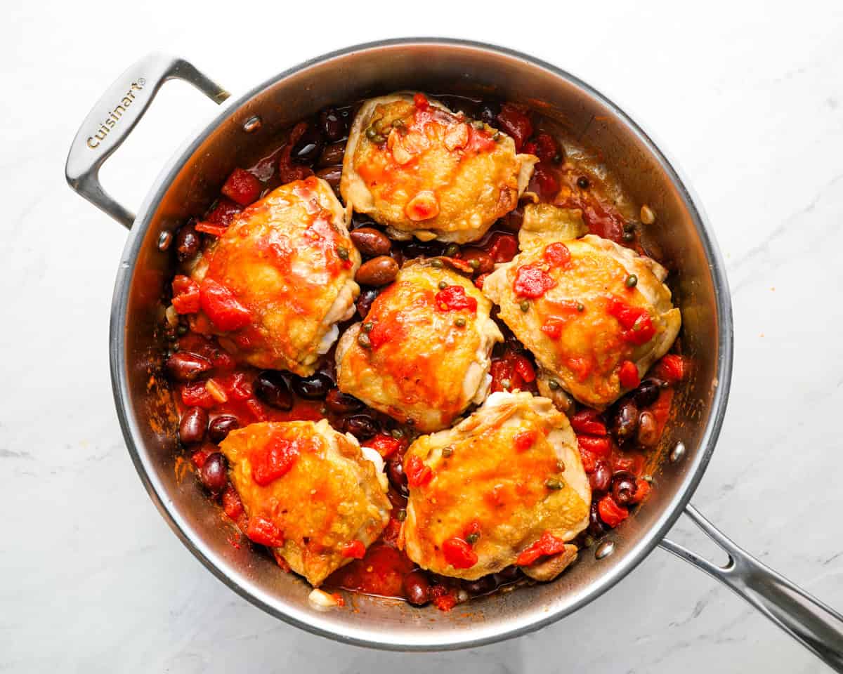 : Add in 1 cup of pitted kalamata olives, 14.5 ounces (1 can) of diced tomatoes with their juices, 2 tablespoons of drained capers, 2 bay leaves, and ¼ cup of chicken broth (or water). Stir to combine, then bring to a simmer and nestle the chicken into the sauce. Spoon a little over each piece of chicken.