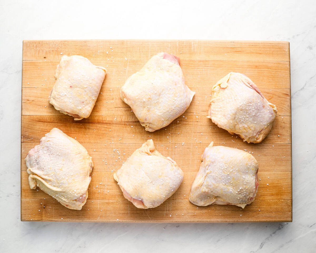 Pat 3 pounds of bone-in, skin-on chicken thighs dry and season lightly with kosher salt on all sides. I used about 1 teaspoon across all the thighs. Remember, we’re adding a lot of other salty components (anchovies, capers, olives), so we don’t need too much salt here.