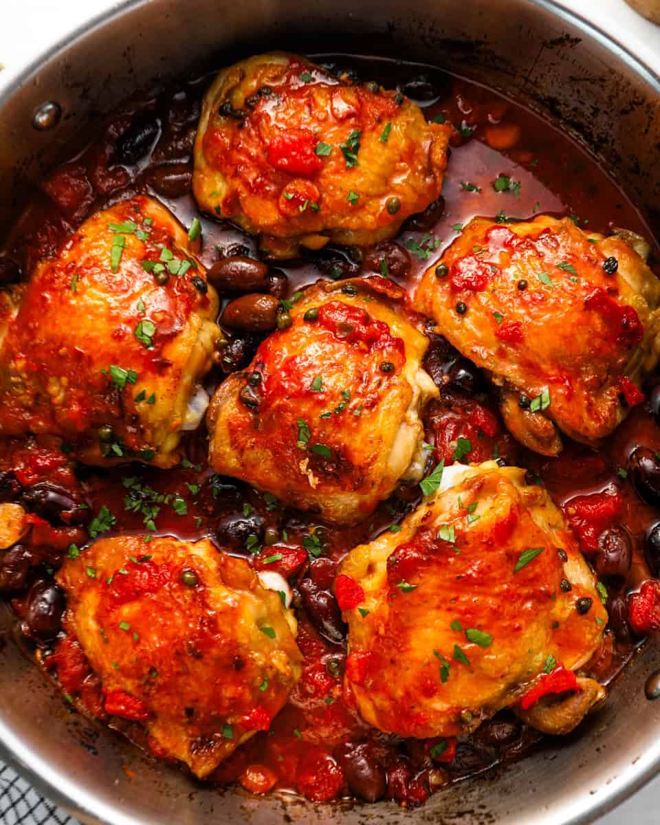 If you love rich and savory chicken dishes, you absolutely must make this chicken puttanesca recipe! I cook fatty chicken thighs with tomatoes, garlic, anchovies, olives, capers, and more to create a deeply tangy puttanesca sauce. This one pot Neapolitan chicken recipe is a satisfying low-carb, keto-friendly meal that my whole family loves!
