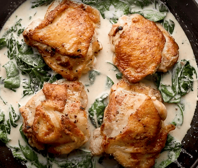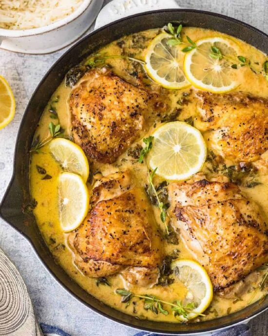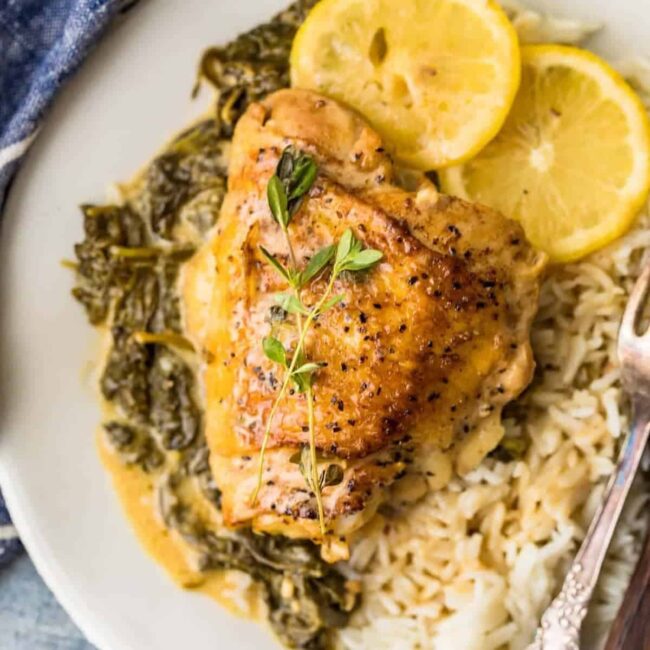This lemon butter chicken recipe is an easy weeknight dinner that’s become a real favorite for my family, and for reader’s families too! I cook up juicy chicken thighs to tender perfection in a creamy lemon and garlic butter sauce, then finish with fresh spinach. This meal is cooked all in one pan for simplicity, and it’s packed with bright lemon flavor!