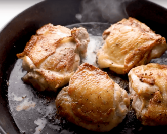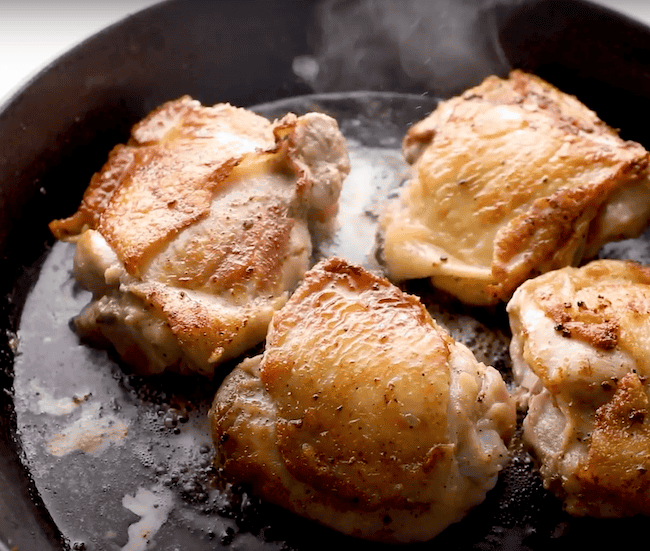 Add the seasoned chicken skin-side down, and sear for 3-4 minutes, or until golden brown; then flip and sear the other side. Remove the chicken from the skillet and set it aside.