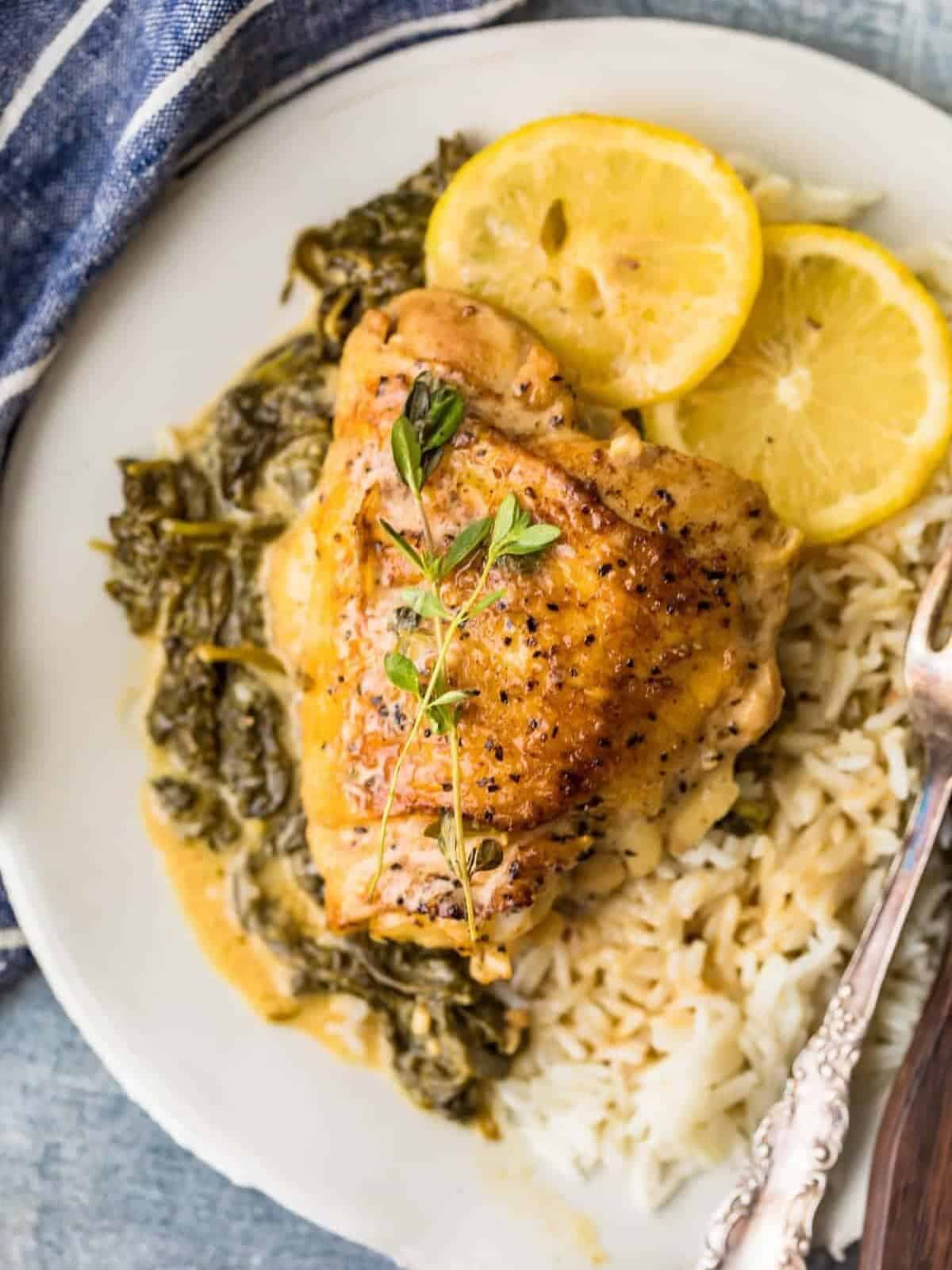 This lemon butter chicken recipe is an easy weeknight dinner that’s become a real favorite for my family, and for reader’s families too! I cook up juicy chicken thighs to tender perfection in a creamy lemon and garlic butter sauce, then finish with fresh spinach. This meal is cooked all in one pan for simplicity, and it’s packed with bright lemon flavor!