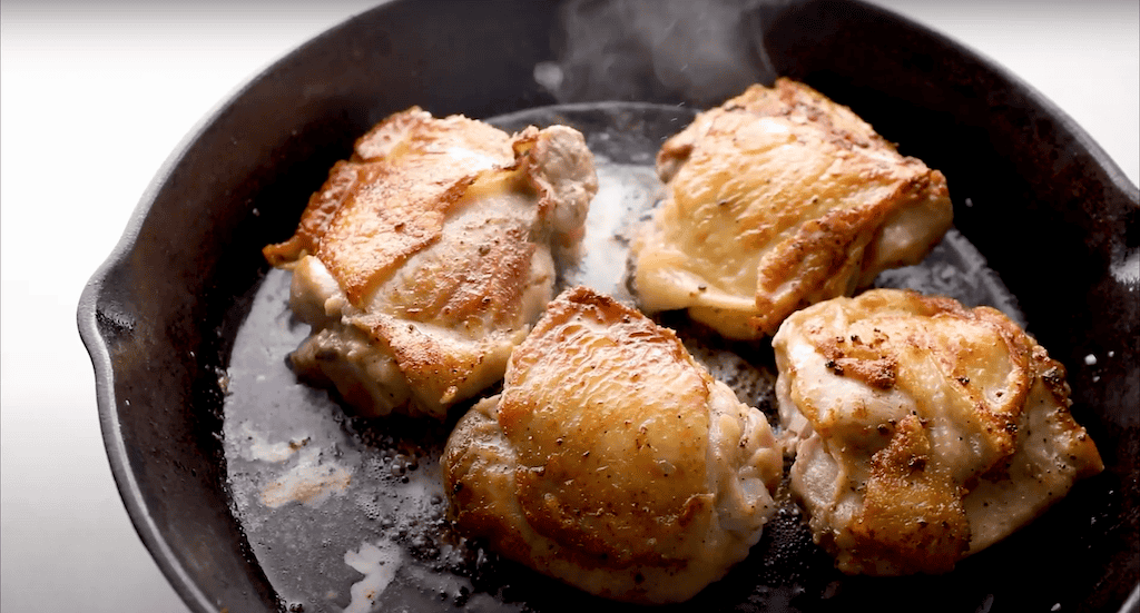 Add the seasoned chicken skin-side down, and sear for 3-4 minutes, or until golden brown; then flip and sear the other side. Remove the chicken from the skillet and set it aside.