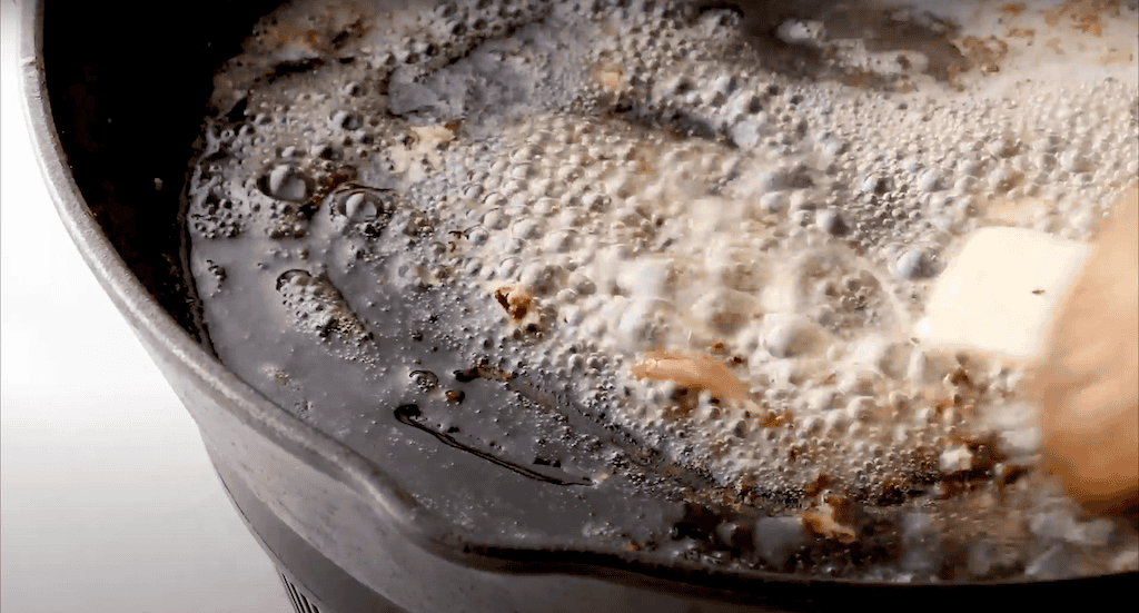 Return the skillet to the heat and add another 1 tablespoon of salted butter. Let it fully melt, stirring and deglazing the pan (scraping up any browned bits) at the same time. Then add 3 cloves of minced garlic and cook for 1-2 minutes, until fragrant.