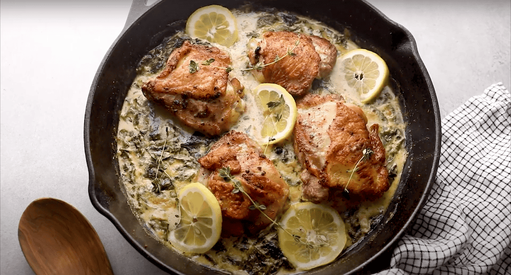 Place the chicken thighs directly in the creamy lemon butter sauce, place the entire pan in the oven, and bake for 25 minutes, or until the internal temperature reaches 165-175°F.