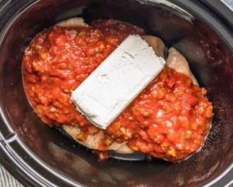 Then pour 24 ounces of chunky salsa over the chicken, and top with 8 ounces of cream cheese.