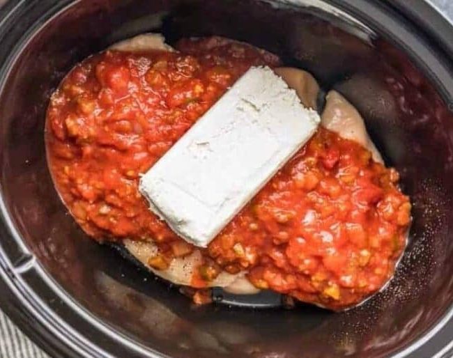 - Pour salsa over the chicken and then top with the cream cheese.24 ounces chunky salsa,8 ounces cream cheese