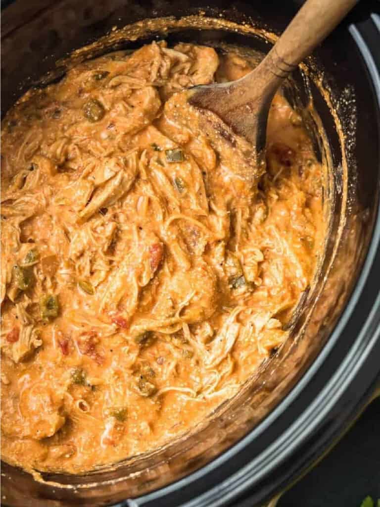 Once cooked, stir everything together. Then shred the chicken using 2 forks. Give it another good stir to fully coat the shredded chicken in the creamy salsa mixture.